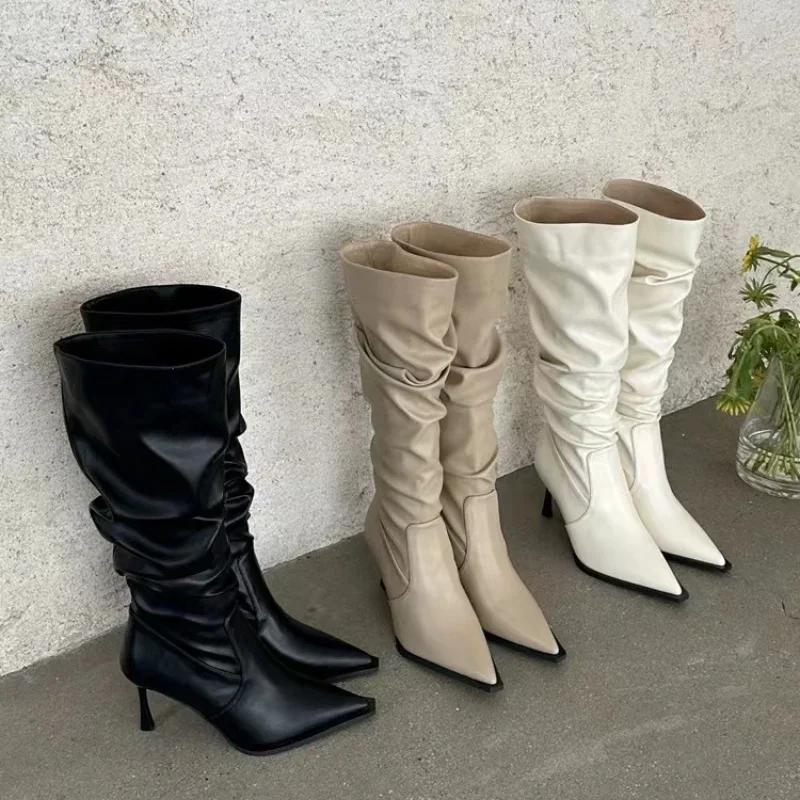 Модные женские остроносые плиссированные сапоги на высоком каблуке черные женские сапоги до колена женские осенние модные шпильки женские остроносые резиновые туфли