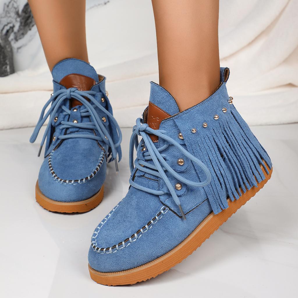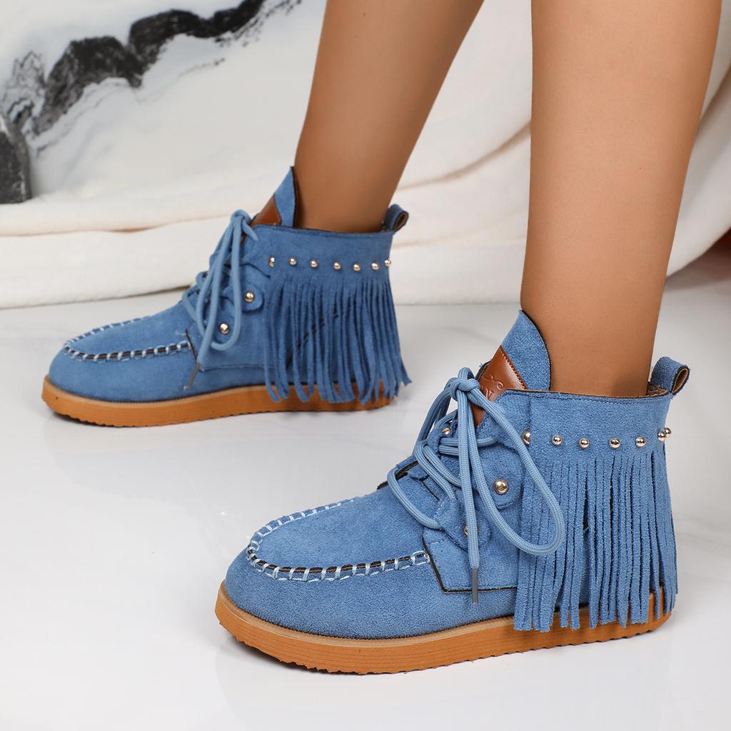 Мода ретро стиль вестерн кисточки ковбойские сапоги женщина 2024 тренд заклепки шнуровка плоские ботильоны женские удобные мягкие ботильоны