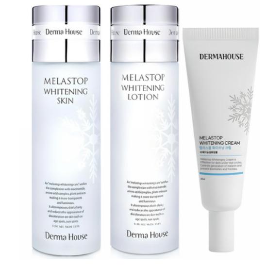 This whitening skincare set from DermaHouse offers a complete 3-step routine: a skin toner, a lotion (emulsion), and a whitening cream. The formulation aims to brighten the complexion, even out skin tone, and provide moisture and nourishment. Ideal for individuals seeking gentle brightening care along with hydration in one cohesive set.