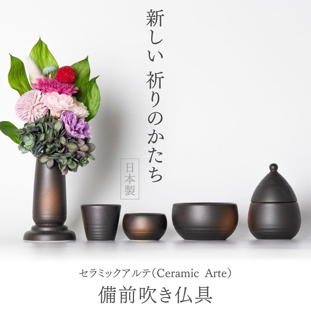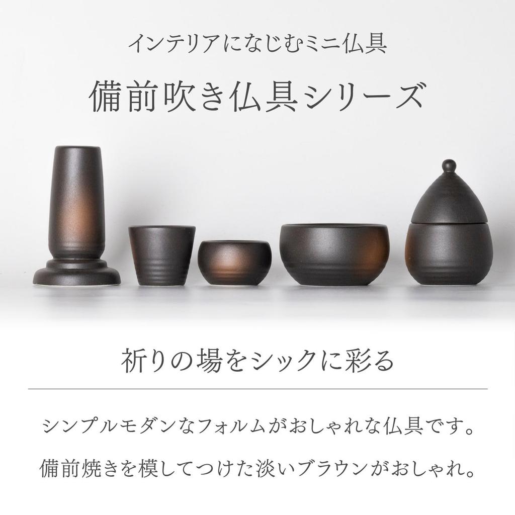 Ceramic Arte Bizen-Blown Buddhist Altar Set (Vase, Incense Burner, Candle Holder with Fire Extinguisher Lid) - 3-Piece Set, Made in Japan, Small,