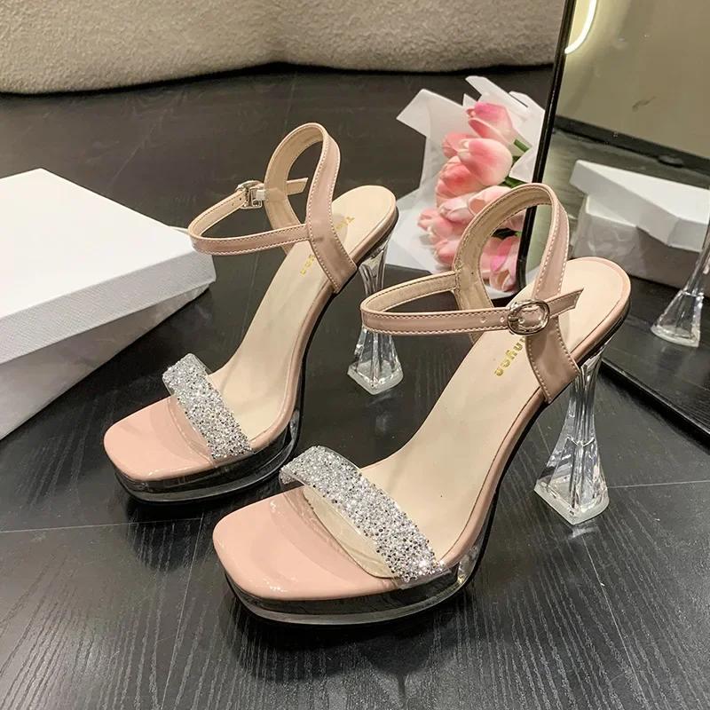 Мода 2025 Лето Женские Свадебные Сандалии Прозрачные Тонкие Каблуки Ремешок с Пряжкой Водонепроницаемая Платформа Стразы Вечерняя Обувь