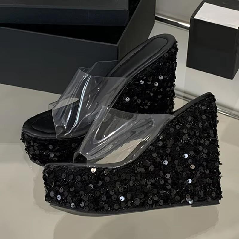 Мода Liyke Мода Серебристый Металл Цветы Женские Клинья Шлепанцы Блестящая Платформа Высокий Каблук Прозрачные Сандалии Женская Вечеринка Выпускной Обувь