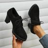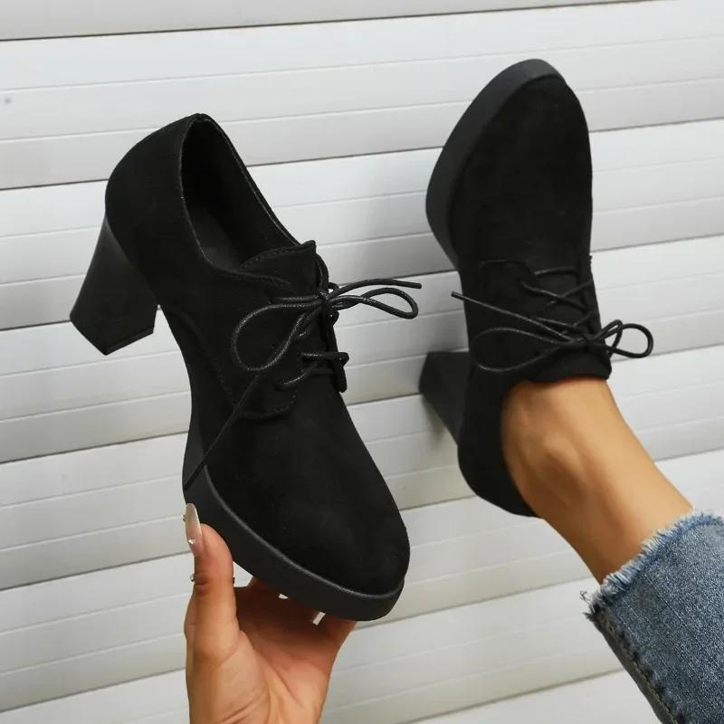 Мода 2024 года, новые черные туфли из кожи, замшевые женские туфли на толстом каблуке, повседневные туфли на высоком каблуке на весну и осень со шнуровкой спереди