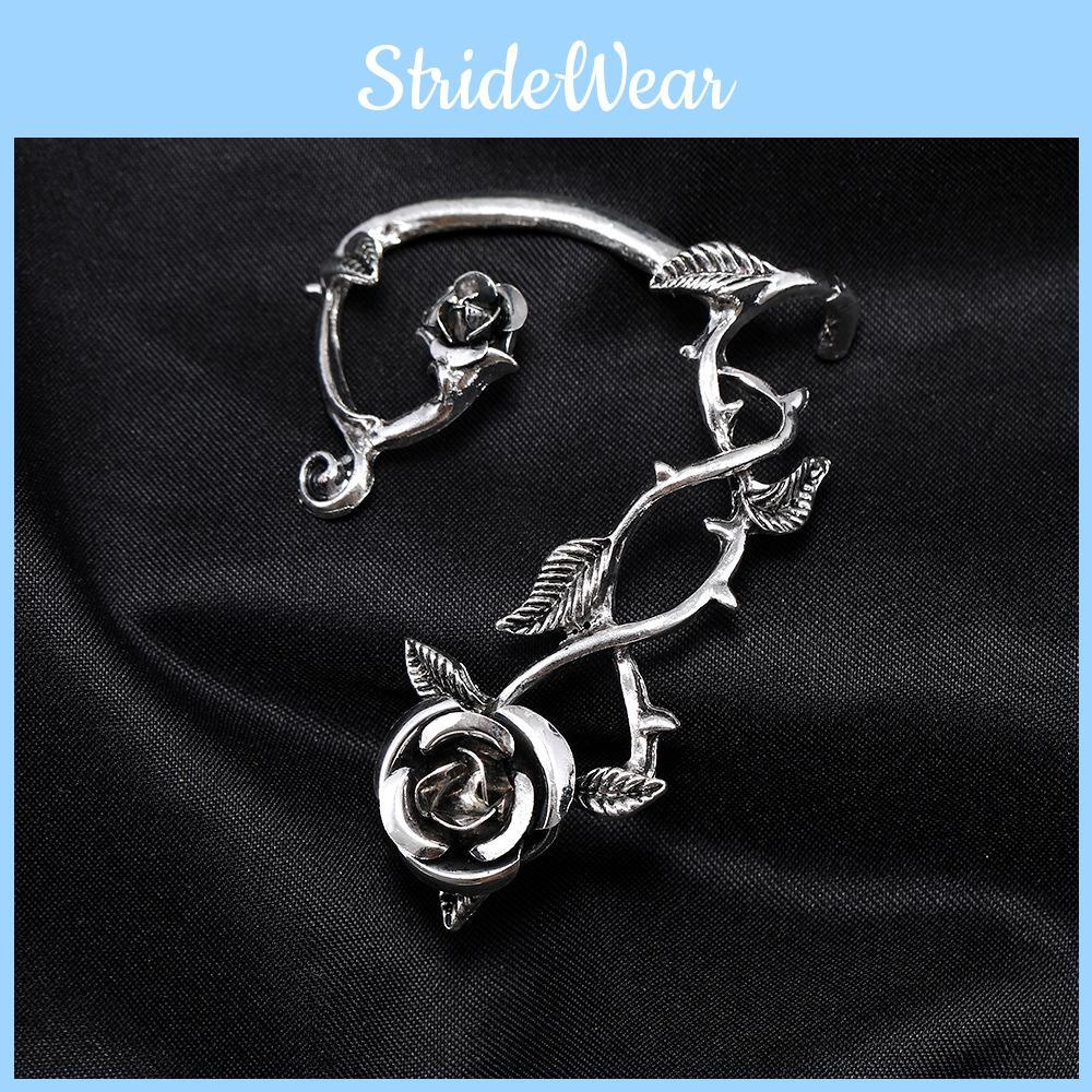 This gothic punk-style single leaf rose cuff earring is crafted from durable alloy with electroplated finishes in black, antique copper, and antique silver. it features a floral design inspired by nature, supporting a bold alternative fashion look. Ideal for themed events or everyday edgy style, it can be cleaned with a soft cloth to maintain its finish.