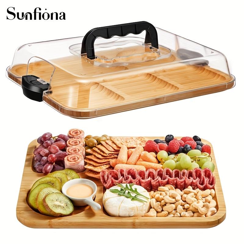 Цельная экологичная бамбуковая доска для сыра с безопасной защелкивающейся акриловой крышкой - Портативный поднос для еды для кемпинга, вечеринок, ресторанов