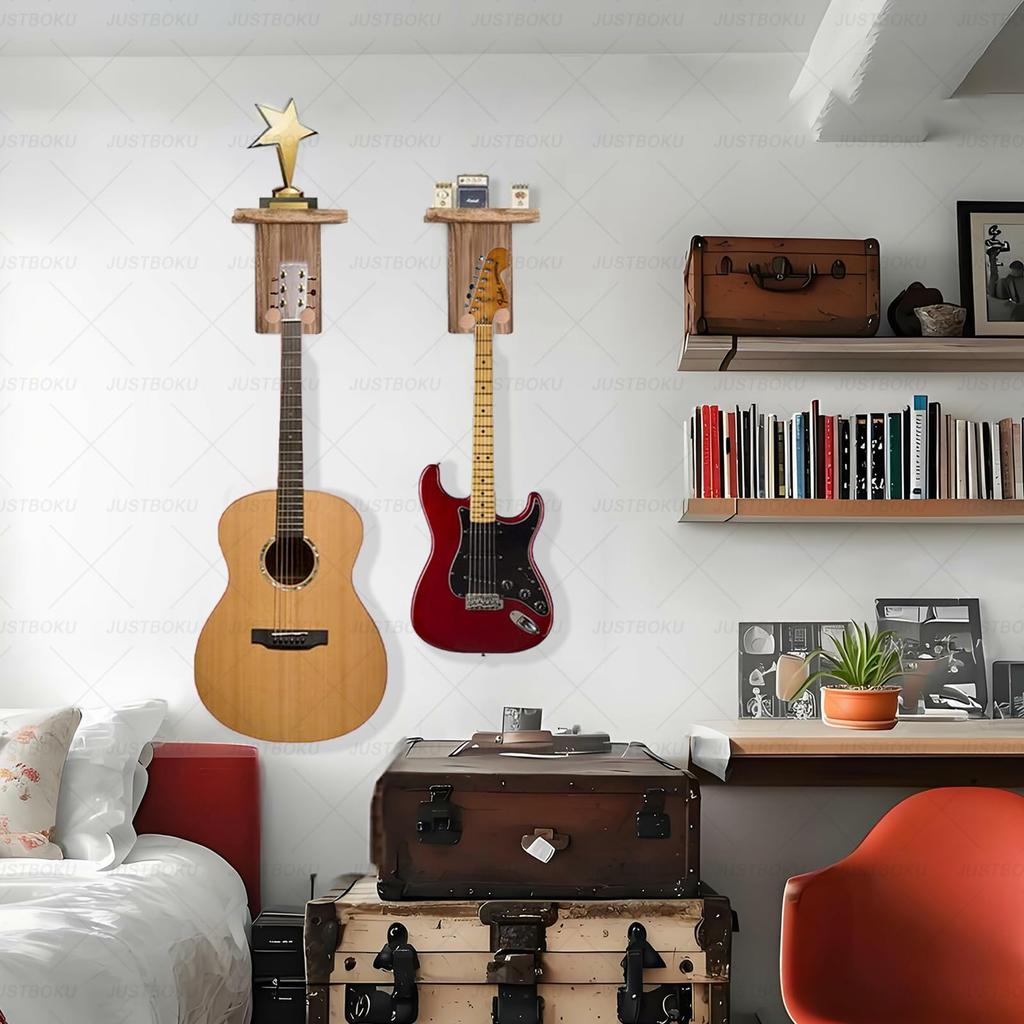 Изготовлено из натурального дерева, излучает теплый и роскошный вид. Красивая текстура дерева полностью проявлена, что отличает его от неорганических пластиковых изделий.. Простой современный дизайн органично вписывается в различные стили интерьера, включая японский, западный, скандинавский и индустриальный.. Гитара и сама гитарная стойка, повешенные на стену, становятся частью стильного интерьера, улучшая атмосферу любой комнаты.. Успокаивающая текстура дерева создает комфортное пространство.