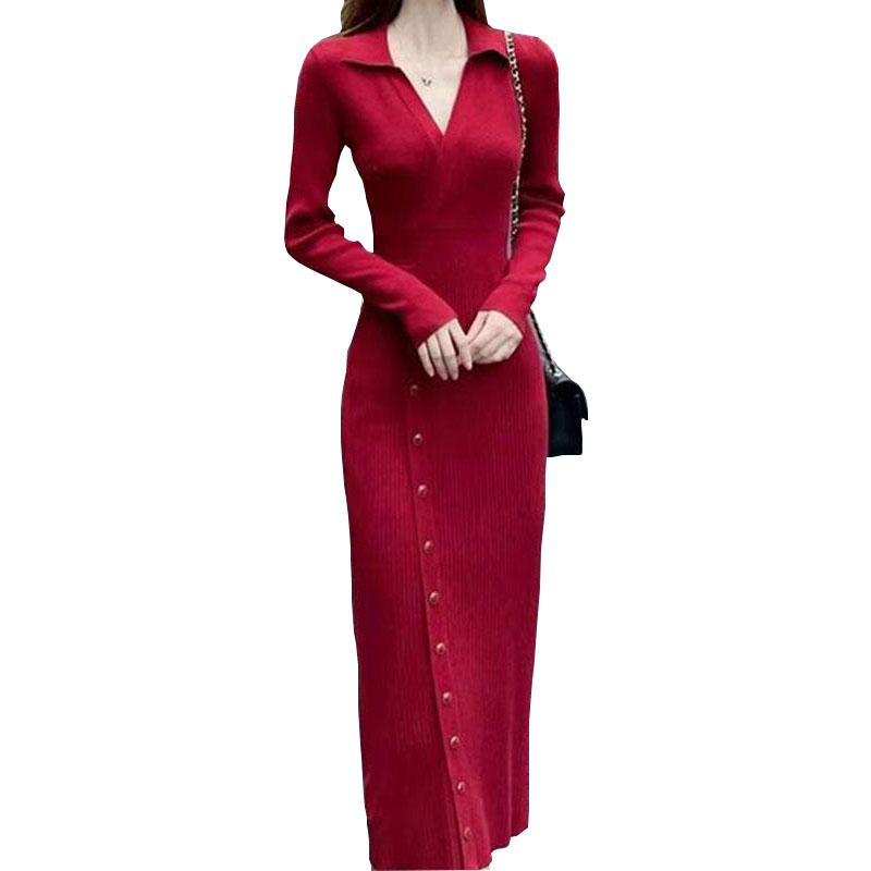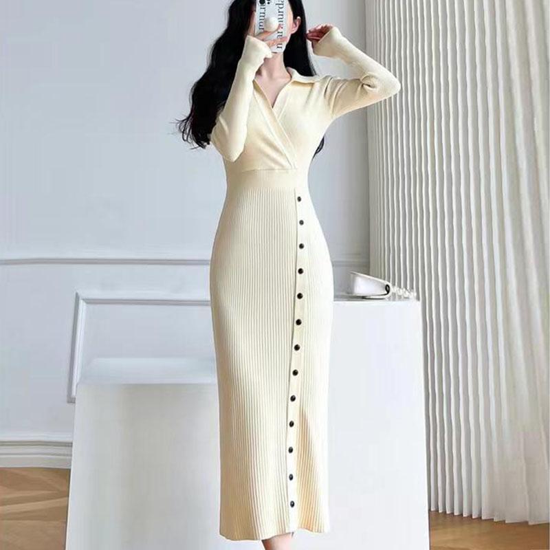 Французское винтажное вязаное платье-свитер поло, женское осенне-зимнее однотонное платье-свитер средней длины с длинными рукавами, женский пуловер