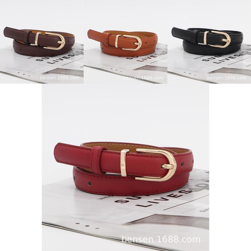 This black slim belt for women features a durable PU leather construction with a metal pin buckle, measuring 105cm in length and less than 2cm wide, ideal for accentuating dresses, skirts, or jeans. Its simple punched design ensures a sleek, minimalist style suitable for business or casual wear. The belt resists stretching and is easy to maintain by wiping with a damp cloth.