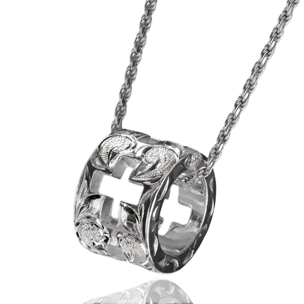 Leilani Hawaiian Jewelry Scroll (Wave) Carved Cross Heavy Tube Pendant Necklace for Men, 925 Sterling Silver (Includes 50cm Rope Chain)