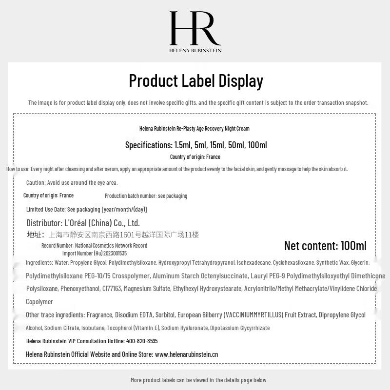 Product (registration/recordation) name: Helena Rubinstein Re-Plasty Age Recovery Night Cream; Helena Rubinstein Re-Plasty Age Recovery Night Cream