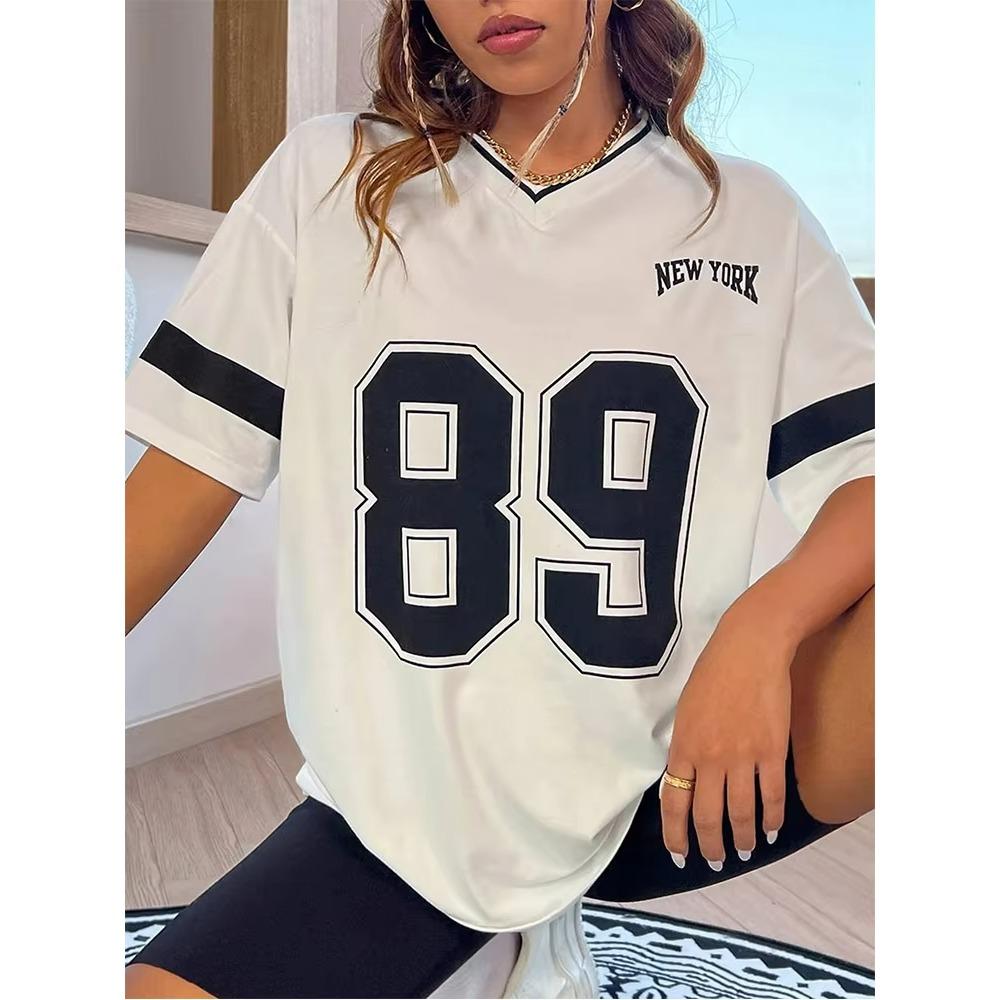 Летние женские футболки Номер 89 Короткий рукав Тренд 3D принт V-образный вырез Спортивные футболки Уличная одежда Оверсайз Повседневная мода Женский топ