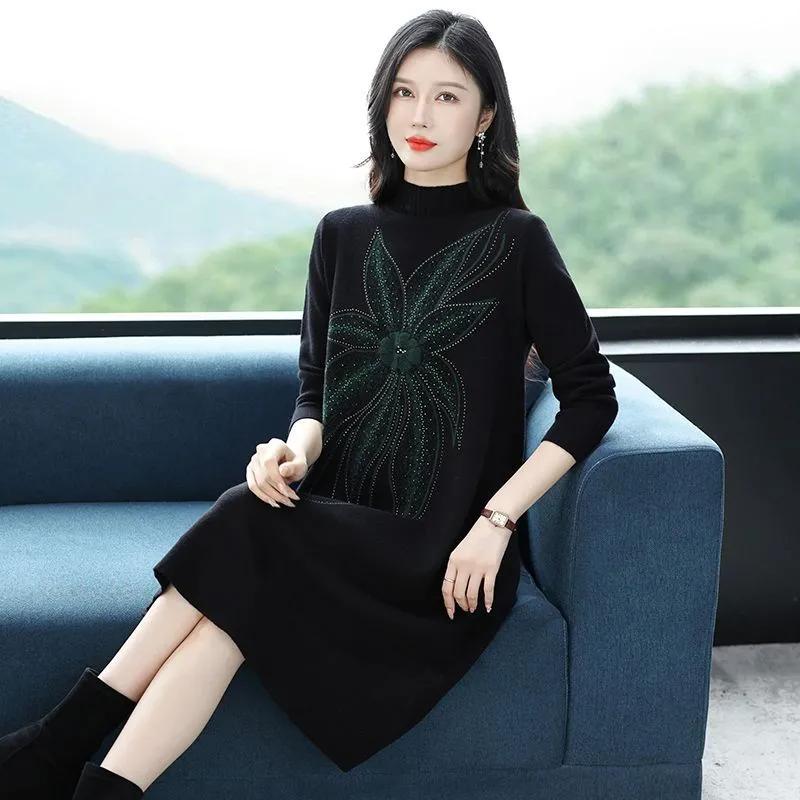 Платье для женщины Хлопок Зима Тепло Круглый вырез Длинный рукав Винтаж Повседневный С принтом Длинные Трикотажные платья-свитера стрейч