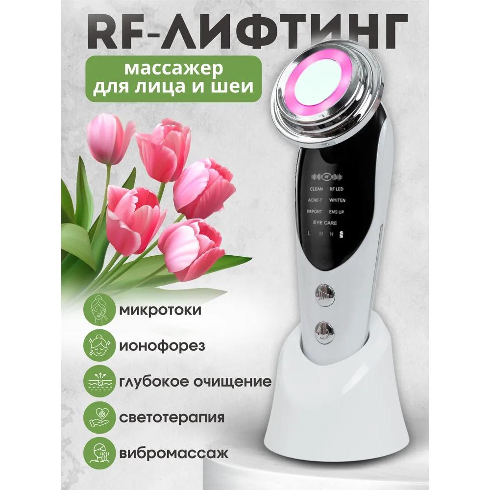 В коплект входит: коробка, инструкция на русском языке, зарядная станция, USB-кабель, кольцо для режима CleanХотите добиться идеальной кожи лица без посещения салона красоты? Это легко и просто, когда у вас есть RF-лифтинг и EMS микротоковый массажер для лица. Современный многофункциональный проводящий микротоковый массажер для лица и шеи — это косметическое устройство, которое сочетает в себе комплексный уход: глубокое очищение, увлажнение, питание и омоложение кожи. Микротоковая реювенация, RF-лифтинг и электростимуляция — спасение для тех, кто боится инъекций.. Лицевой электромассажер сочетает в себе 7 режимов работы. Ионная чистка действует как устройство для очистки кожи. Радиочастотный лифтинг для лица и радиочастотный лифтинг вокруг глаз разглаживают морщины, уменьшают объем подкожного жира и устраняют двойной подбородок. Антивозрастное устройство уменьшает темные круги под глазами и избавляет от гусиных лапок.. Криотерапия усиливает эффект RF-лифтинга за счет охлаждения кожи. Криотерапия также сужает поры и уменьшает отечность лица. Успокаивает кожу после процедур. Микротоки EMS для лица стимулируют мощную выработку коллагена и эластина, устраняют морщины и складки, создают лимфодренажный массаж и укрепляют мышечный каркас.. Косметический аппарат в режиме фонофореза улучшает кровообращение, позволяет активным ингредиентам косметических средств проникать глубоко в кожу без инъекций и увеличивает их эффективность в несколько раз.. Ручной миостимулятор подходит для светотерапии (светодиодная терапия). Во время процедуры фотонное омоложение уменьшает воспаление, стимулирует выработку коллагена и уничтожает патогенные бактерии.. Благодаря нашему косметическому гаджету для домашнего использования, ваше лицо будет сиять изнутри, и у вас будет подтянутый контур лица и ровный тон кожи.. Обратите внимание, что миостимуляцию, вибрационный массаж и лифтинг лица и шеи можно делать в любое свободное время, и это обойдется вам дешевле, чем в салоне.. Важно, что их эффективность научно доказана. Сделайте свой ежедневный уход за кожей таким же качественным, как в кабинете косметолога. Сделайте идеальный подарок — электрический массажер для лица — себе, своей маме или другу.