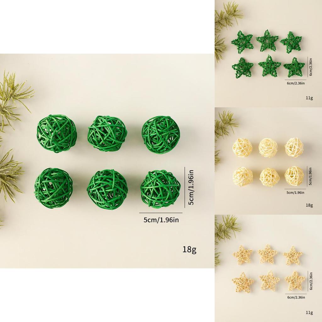 This decorative set features handcrafted woven star and ball ornaments, crafted from durable rattan material. The woven five-pointed stars come in natural wood, red, and green colors.