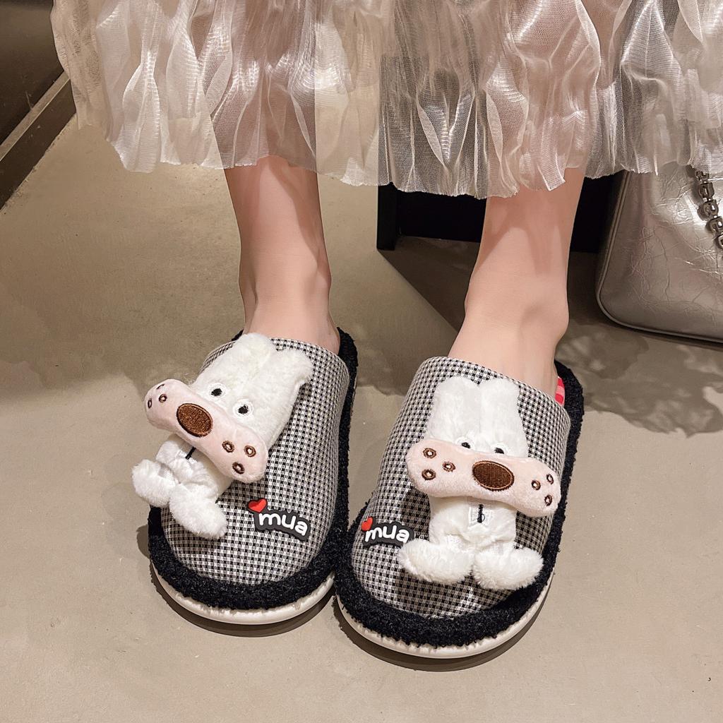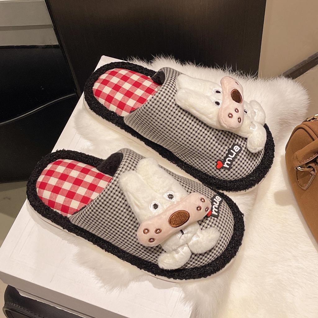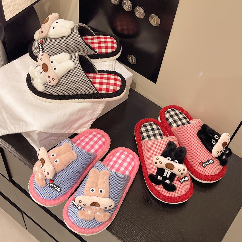 Милые мультяшные забавные клетчатые повседневные хлопковые тапочки женские осенне-зимние кукольные уличные домашние на плоской подошве пушистые тапочки женская обувь