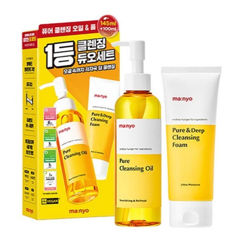 The MANYO FACTORY Pure Cleansing Duo Set includes the brand’s best-selling Pure Cleansing Oil (145 ml) and Pure Cleansing Foam (100 ml) — a complete double-cleansing routine designed to remove makeup, sunscreen, excess sebum, and impurities while keeping the skin soft and hydrated. The cleansing oil melts away heavy makeup and pore impurities, while the cleansing foam provides a refreshing, deep cleanse with a non-stripping finish. Perfect for all skin types and daily cleansing.