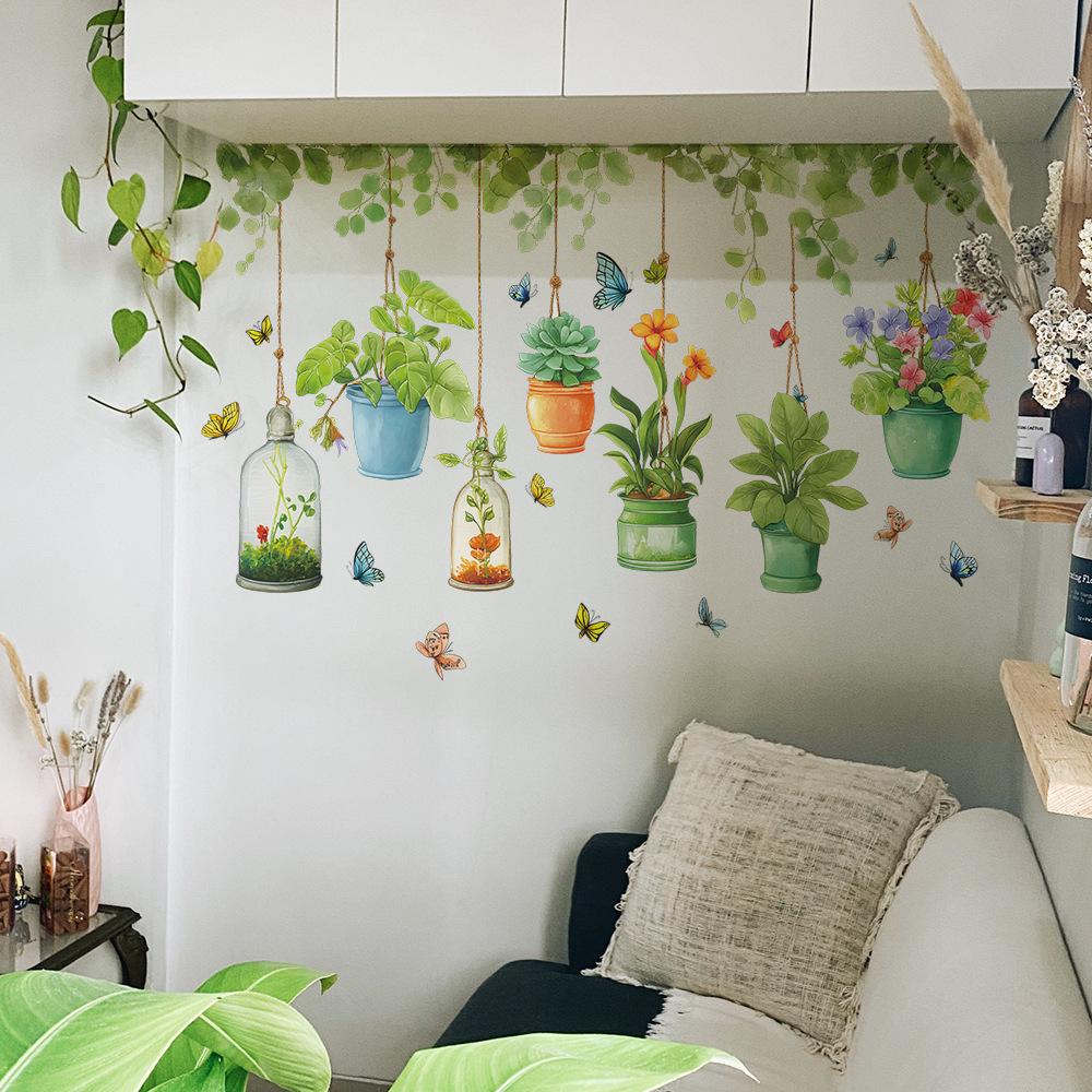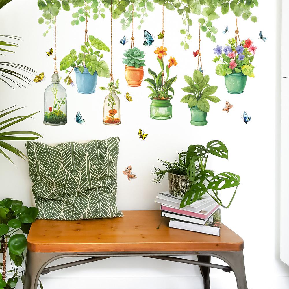 Cartoon Flower and Green Plant Hanging Baskets, Green Leaves, Vines, Butterflies, Home Background and Wall Beautification Stickers