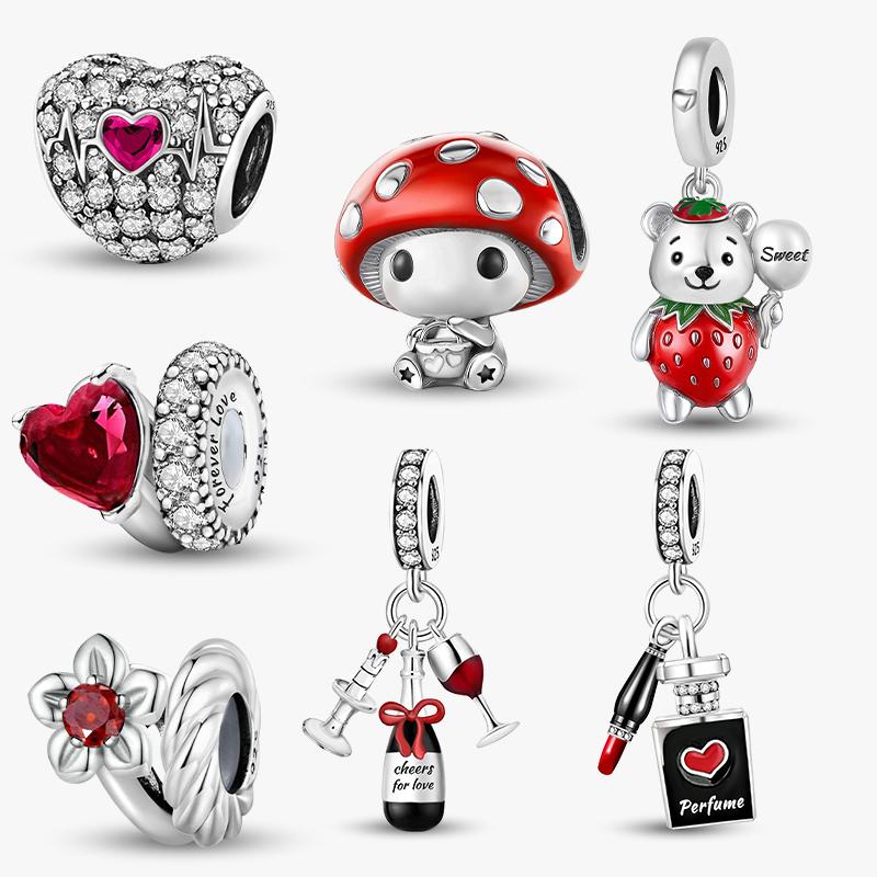 Медные грибы, клубничный медведь, сердце любви, красные шармы-бусины, подходят для оригинальных браслетов, браслетов, ювелирных изделий, подарок для женщин