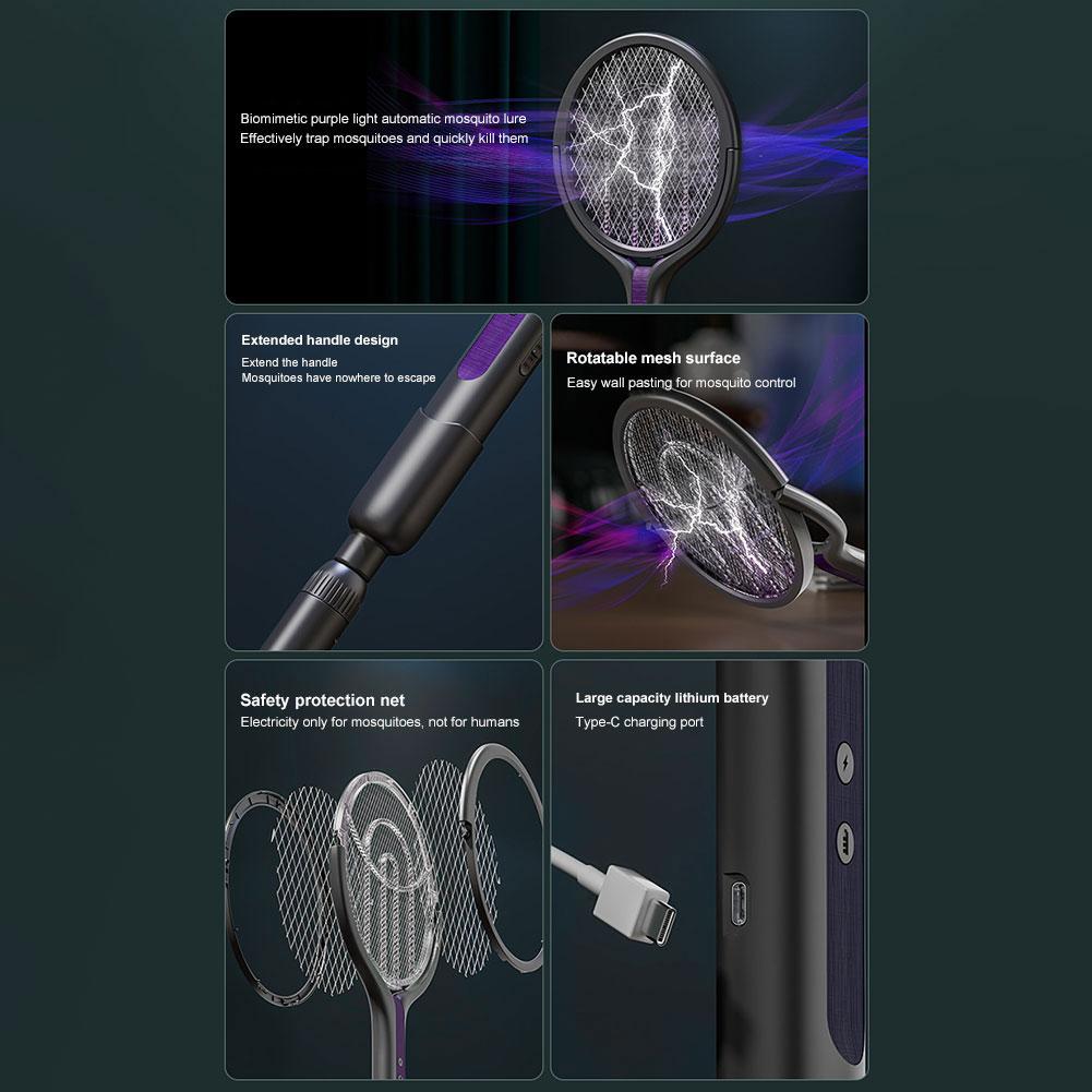 Ракетка-мухобойка с вращающейся головкой, перезаряжаемая, 2 в 1, уничтожитель мух и лампа-ловушка для комаров для использования в помещении и на улице