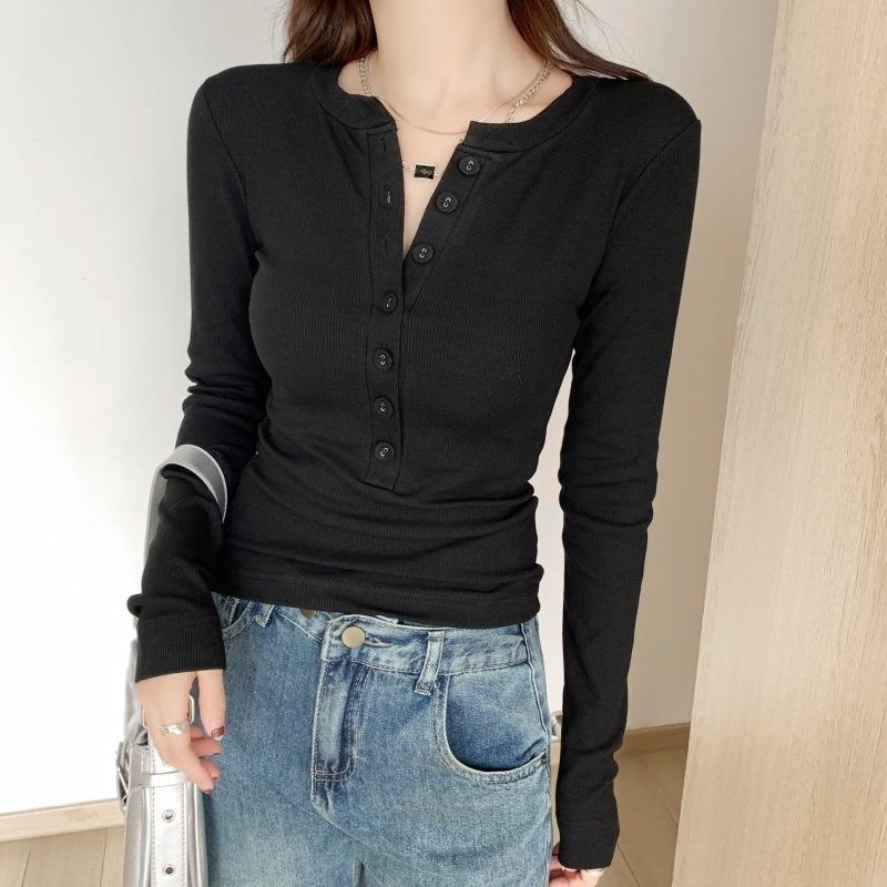 Vintage slim-fitting and thin bottoming shirt women's spring single-breasted button-up front shoulder long-sleeved T-shirt with top inside