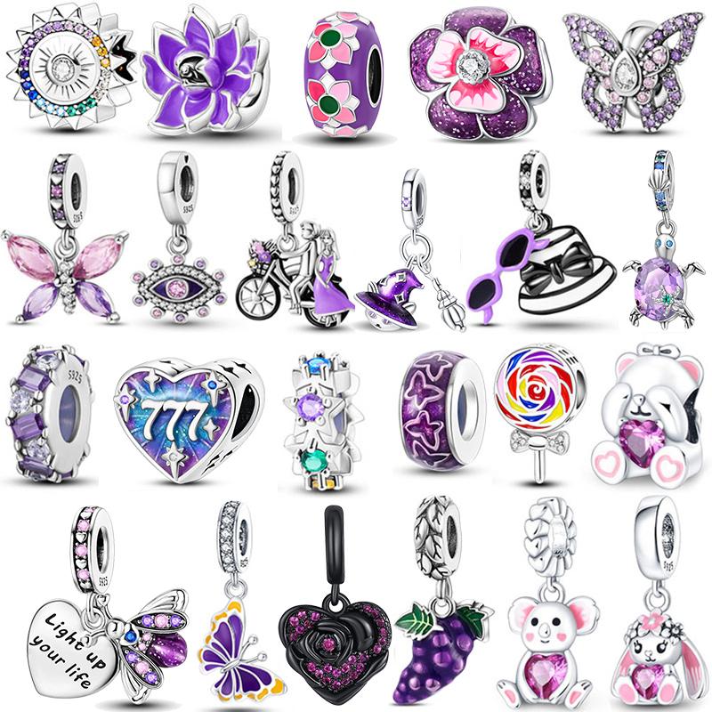 Copper Purple Murano Bead Pansy Flower Dangle Charm Fit Original Brand Bracelet And Necklace Jewelry