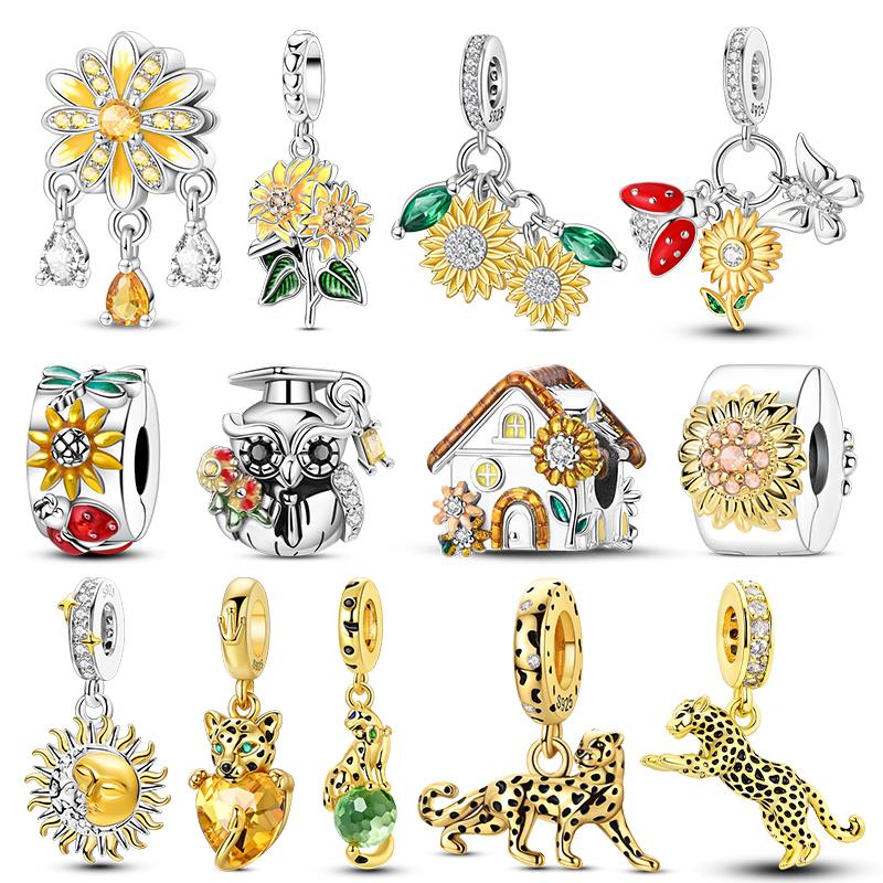 Copper Yellow Flower Sunflower Pendant House Owl Beads Golden Leopard Charms Beads Fit Diy Copper Bracelets Jewelry