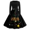 Женское повседневное модное платье с круглым вырезом и длинным рукавом с новогодним принтом в ретро-стиле