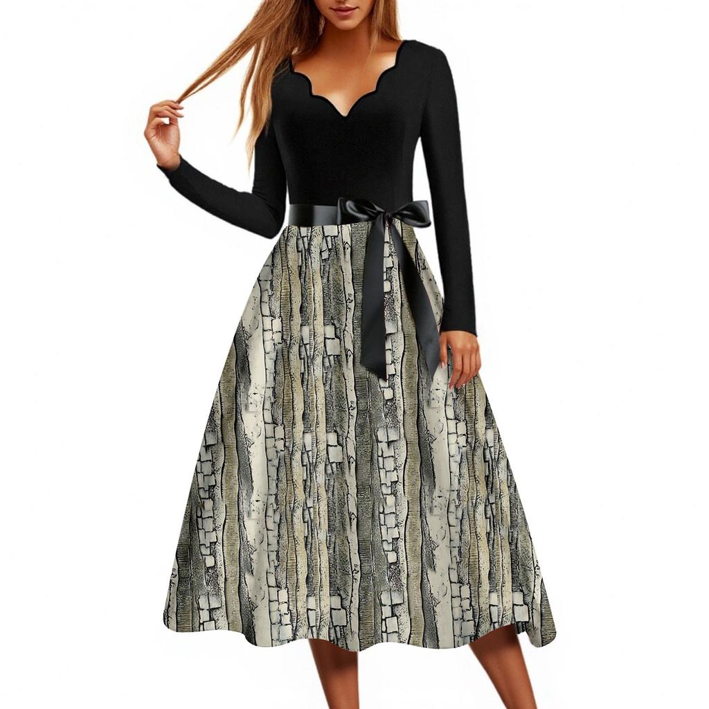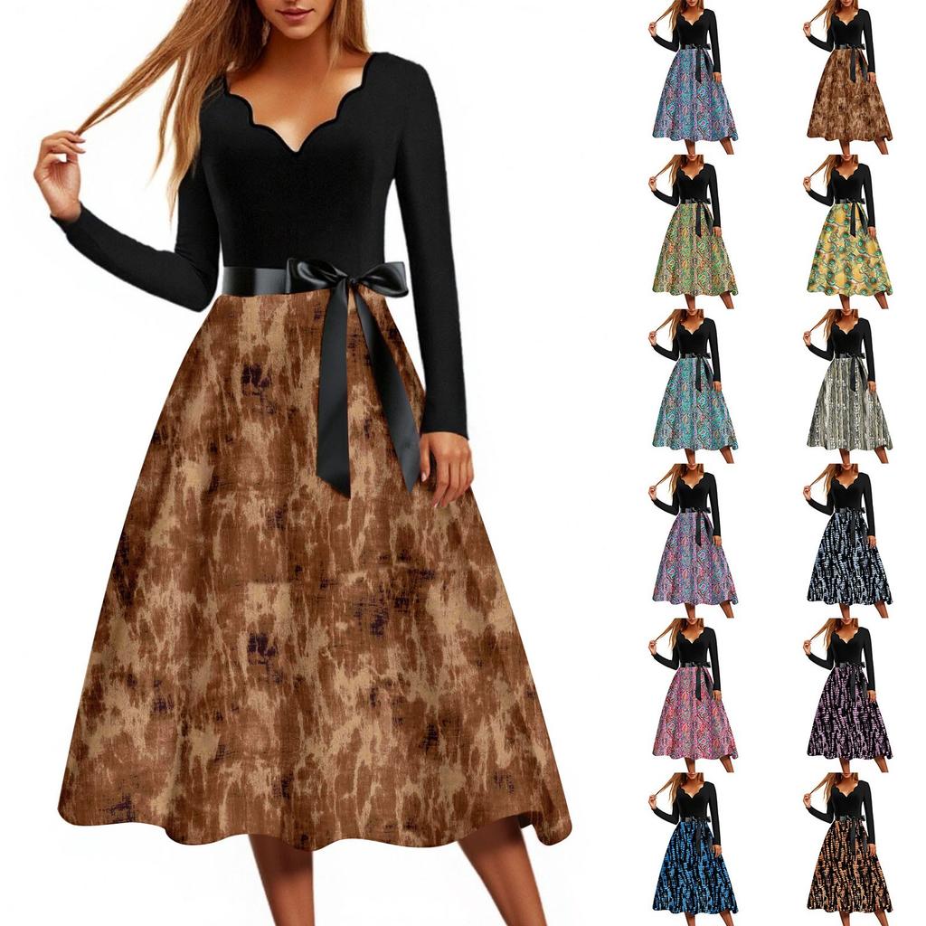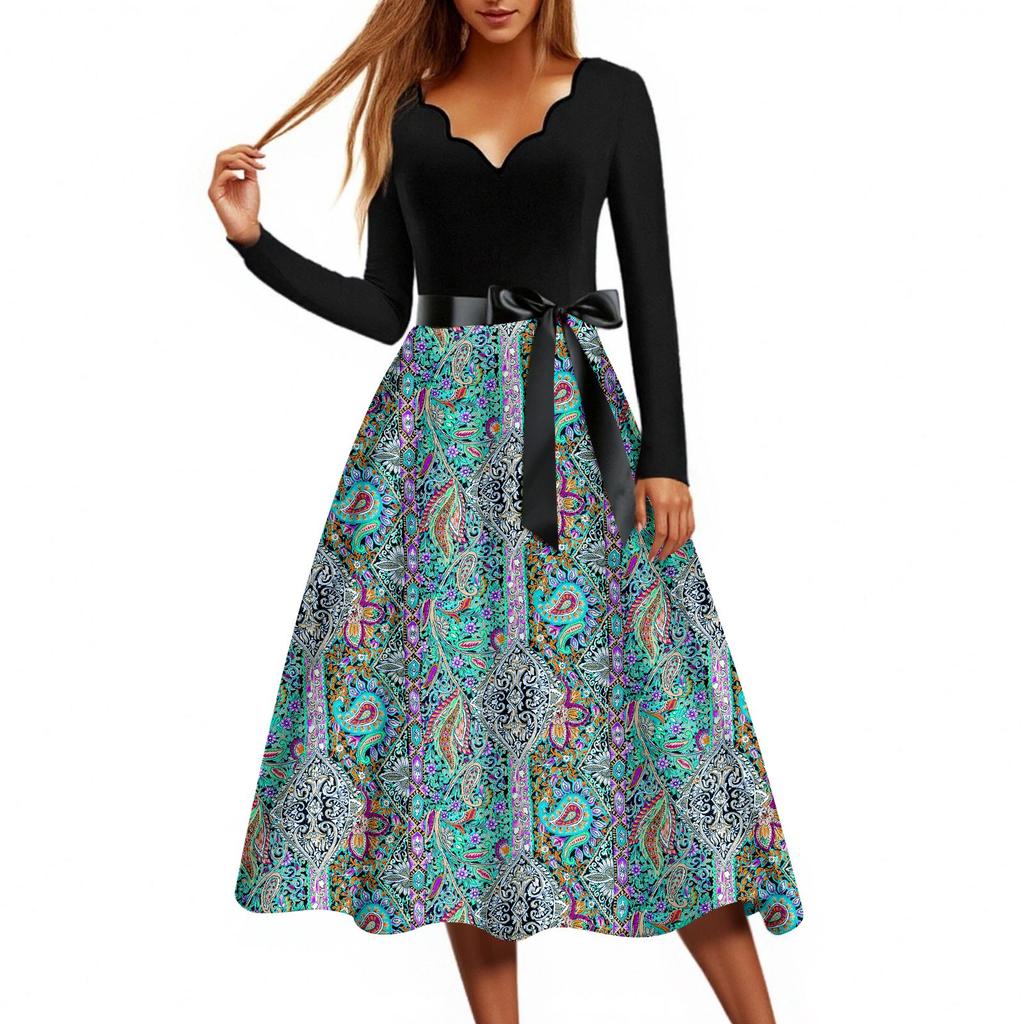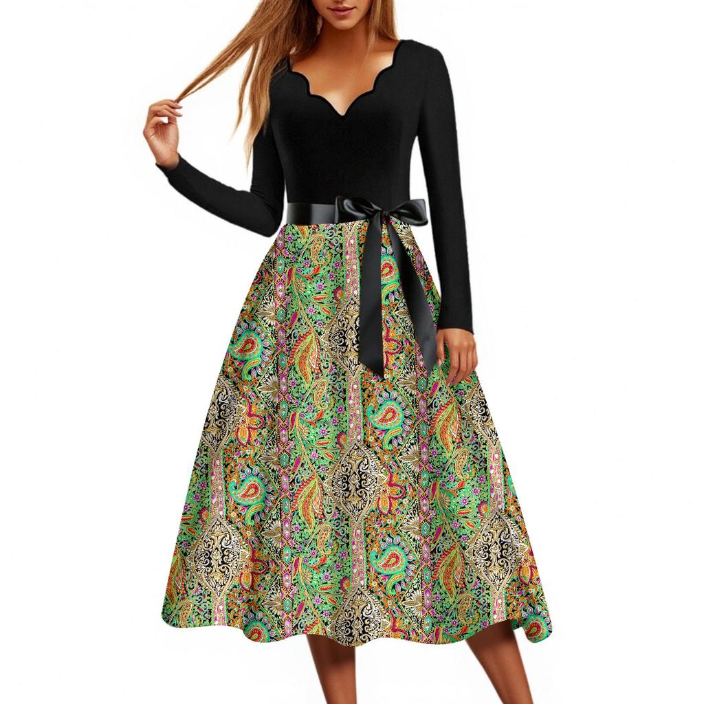 Women's Casual Fashion Floral Print Wave V Neck Vintage Dress