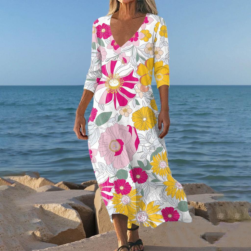 Dresses For Womens Vintage Print Tunic Waisted Midi Dress Summer Casual 3/4 Sleeve Dress