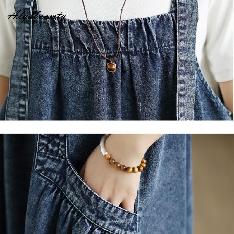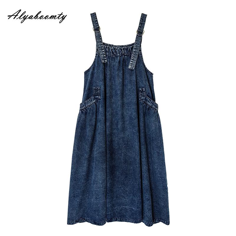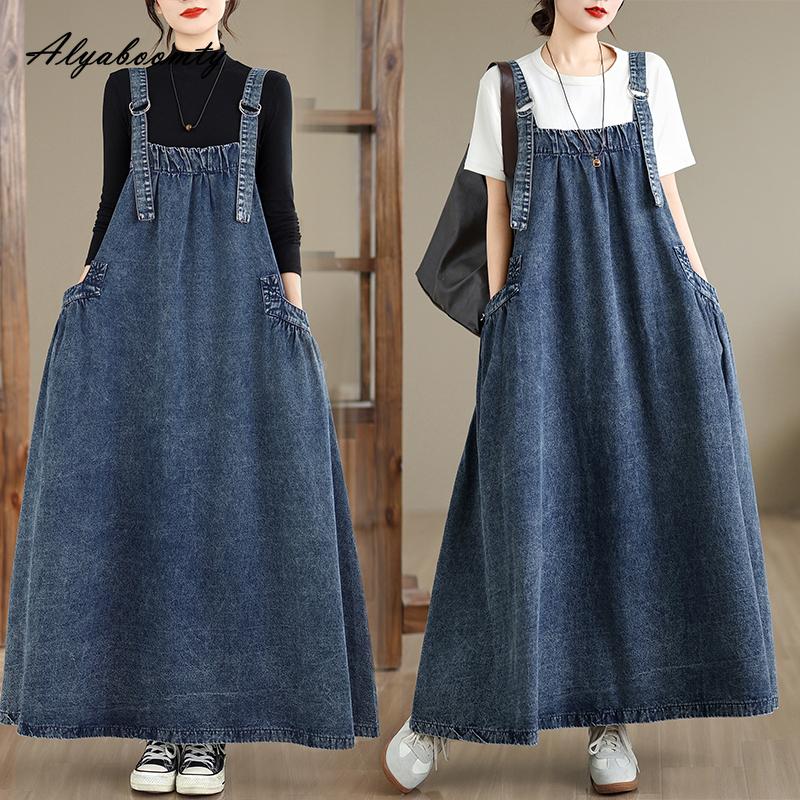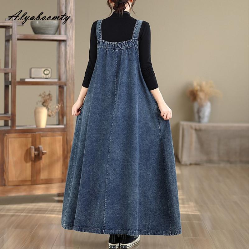 Большой размер Весенне-осенний женский джинсовый сарафан на бретелях-спагетти, синее платье оверсайз без рукавов, повседневное лаконичное женское платье большого размера с карманами