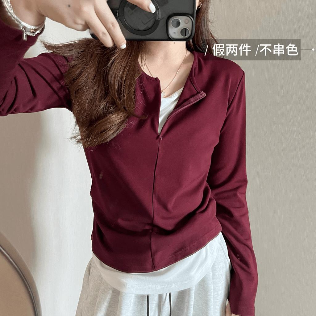 Женский топ-футболка с полузастежкой-молнией, имитация двух частей, весенний, бордовый, контрастная вставка, с длинным рукавом, базовый — купить товар онлайн с бесплатной доставкой по всему миру!