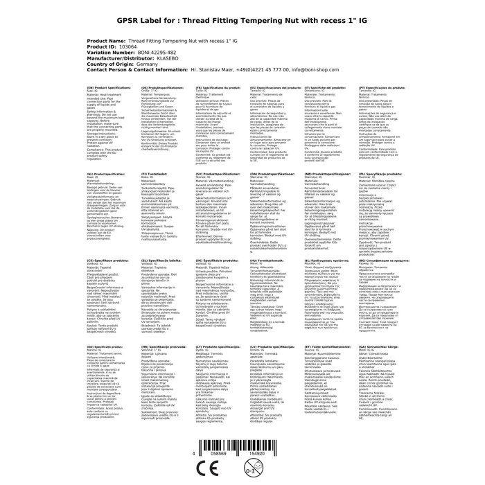 Raccord fileté en fonte malléable contre-écrou avec renfoncement 1" IGLes raccords en fonte malléable sont des éléments de connexion de tuyaux utilisés généralement pour le transport de liquides et de gaz. Les domaines d'application sont extrêmement variés : de l'installation sanitaire, de chauffage et de gaz aux systèmes de réfrigération et de climatisation, en passant par les systèmes de sprinklers et d'extinction de gaz, la construction d'installations industrielles, la construction de machines, la construction de stations-service, la construction de machines à papier et d'imprimerie jusqu'à la construction de véhicules utilitaires.Les connexions filetées ne sont pas auto-étanches. Pour l'étanchéité, il convient d'utiliser par exemple du ruban Téflon ou du chanvre.Données techniques:Homologation : DVGWNorme : DIN EN 10242 / UBA METALLETraitement de surface : GalvaniséMatériau : FonteRésistance à la traction : < 350 N/mm²Température / pression de service maximale : -20°C à 120°C à 25 bar (jusqu'à 300°C à 20 bar)IG = Filetage intérieurAG= Filetage extérieur" = Pouce1" IG x 2"AG = 1 pouce filetage intérieur x 2 pouces filetage extérieurType de filetage:Les filetages de tous les raccords de tuyaux sont fabriqués selon les normes courantes ISO 7-1/EN 10226-1 (filetage intérieur et extérieur) ainsi que ISO 228-1 (écrous de raccordement). Les filetages extérieurs sont coniques. Les filetages intérieurs sont parallèles. Tous les filetages sont indiqués en pouces. Les filetages sont étanchéifiés avec un matériau d'étanchéité approprié tel que du ruban d'étanchéité PTFE ou du chanvre d'étanchéité.Filetage de tuyau Whitworth pour tuyaux filetés et raccordsFiletageen poucesFiletage extérieuren mmFiletage intérieur / diamètre de noyauen mmFiletspar poucePasen mm1/4"13,15711,445191,3373/8"16,66214,95191,3371/2"20,95518,631141,8143/4"26,44124,117141,8141"33,24930,291112,3091 1/4"41,9138,952112,3091 1/2"47,80344,845112,3092"59,61456,656112,309 Le vendeur confirme que ses produits sont conformes à toutes les lois applicables et ne sont proposés que s'ils sont conformes aux politiques de Joom et aux lois européennes sur la sécurité et la conformité des produits.