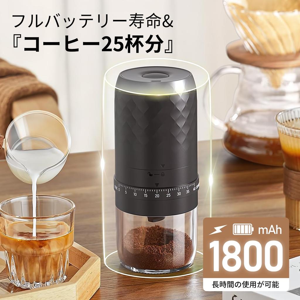 [Высокая производительность для долгосрочного использования] Электрическая кофемолка оснащена аккумулятором большой емкости 1800 мАч, позволяющим приготовить 25 чашек кофе при полной зарядке. Функция внешней регулировки была улучшена для более удобного управления. Электрическая кофемолка позволяет регулировать грубость и тонкость помола в любое время в соответствии с вашими личными предпочтениями, обеспечивая комфортное использование.
