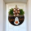 Halloween Door Sign with Cute Ghost Design | Wooden Wreath with Bow for Porch Decor | Farmhouse Style Front Door Welcome Hanger