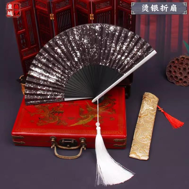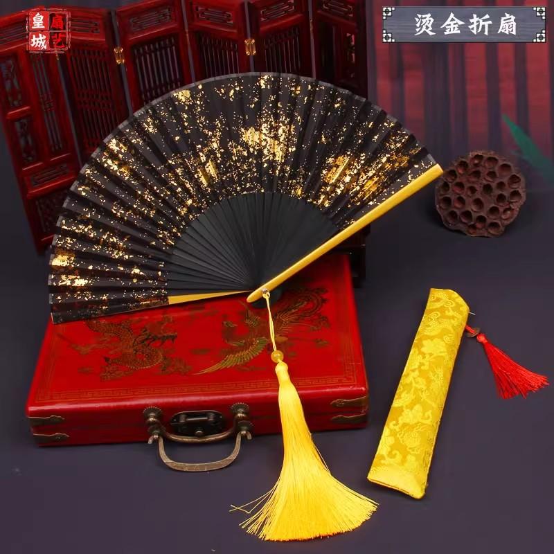 Китайский ручной складной веер - Золотая/Серебряная вышивка фольгой, Элегантный дворцовый веер для женщин, Аксессуары для танцевального костюма Ханфу