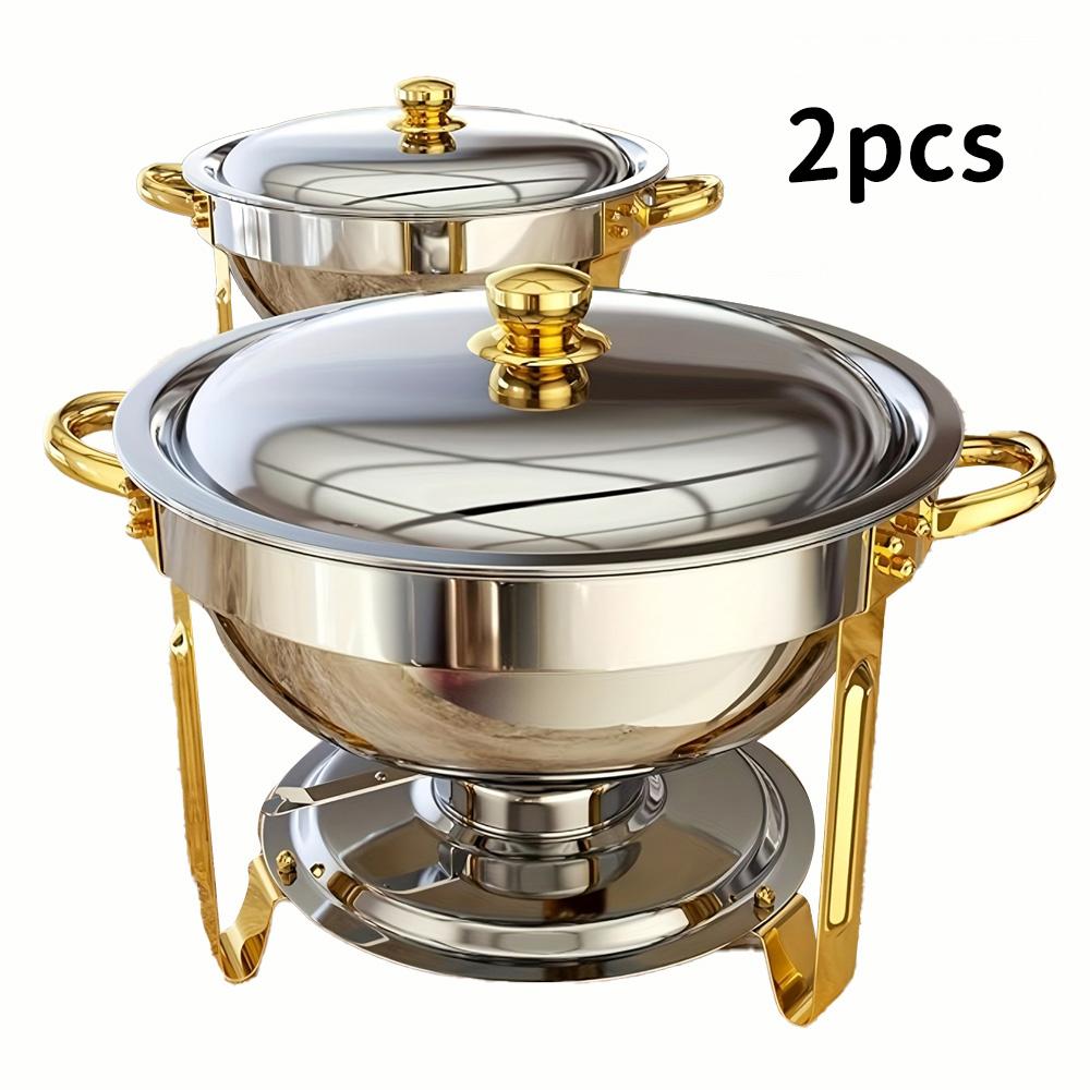 Набор термоизолированных кастрюль золотого и серебряного цвета для еды, включающий круглую термоизолированную кастрюлю из нержавеющей стали объемом 5 кварт, крышку и подставку. Подходит для вечеринки