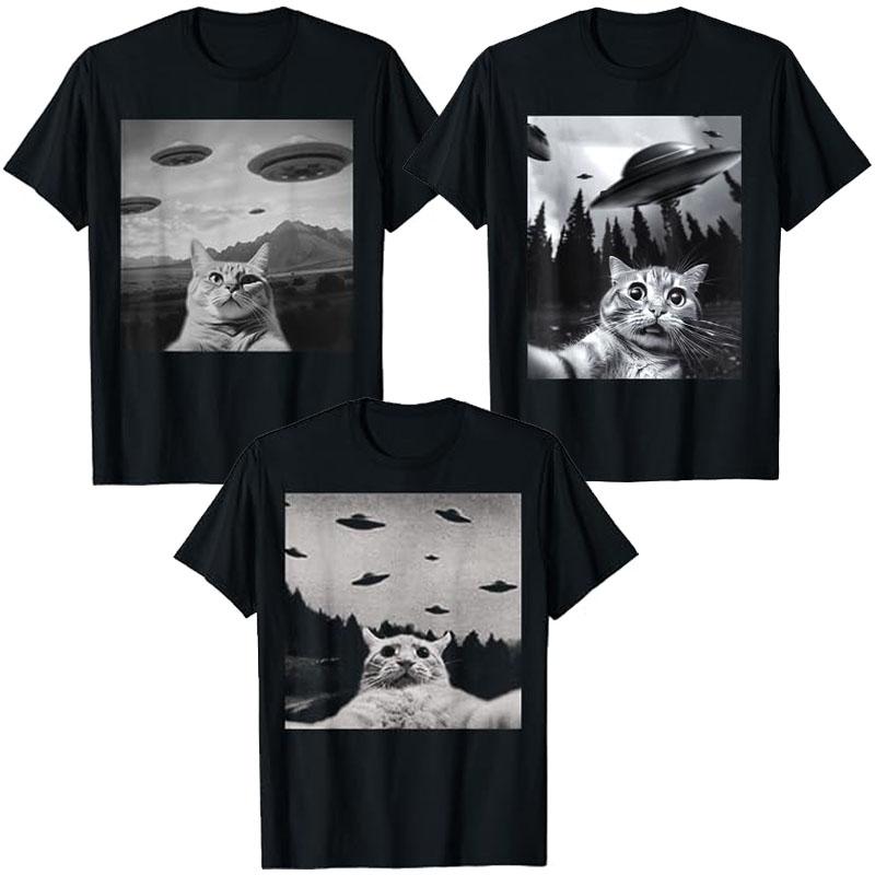 Футболка с изображением кошки-инопланетянина и НЛО, селфи кошки с НЛО, футболка для любителей инопланетян и внеземных существ, забавная футболка с графическим принтом для любителей кошек, подарки.