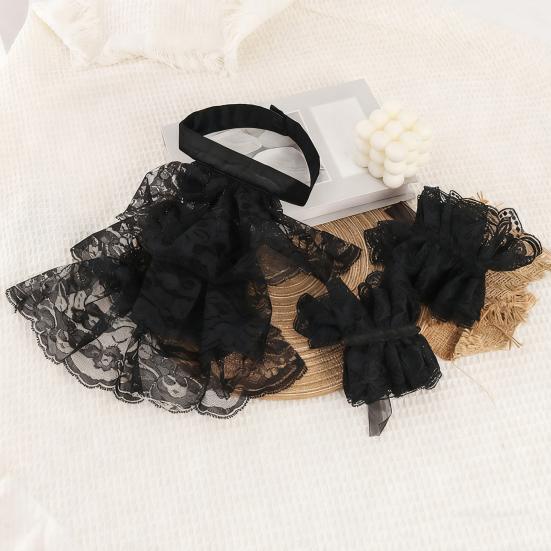 Дополните свой наряд этим изысканным набором с оборками на воротнике и манжетах, изготовленным из приятного к коже кружевного материала.. Этот комплект, изготовленный из высококачественного полиэстерового кружевного полотна, дарит мягкое и нежное прикосновение, при этом он дышащий и легкий.. Воротник и манжеты разработаны для длительной носки без дискомфорта, что делает их идеальными для различных случаев.. Этот набор включает в себя многослойный съемный воротник и пару кружевных манжет, предоставляя все необходимые аксессуары для классического ретро-образа.. Сложный узор демонстрирует его высококачественную текстуру, напоминающую об элегантности викторианской эпохи.. Благодаря гибкому и регулируемому дизайну эти аксессуары подходят для разных размеров шеи и запястья, обеспечивая удобную посадку для большинства людей.. Независимо от того, наряжаетесь ли вы клоуном, вампиром, принцессой, судьей или принцем, этот универсальный аксессуар без труда дополнит различные образы персонажей.