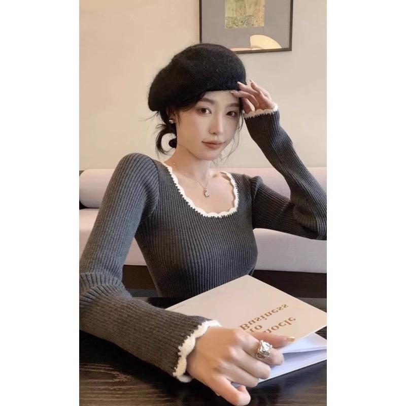 Женский вязаный свитер с контрастным квадратным вырезом и кружевом, весенний новый облегающий топ в стиле Spice Girl с длинным рукавом, базовая рубашка