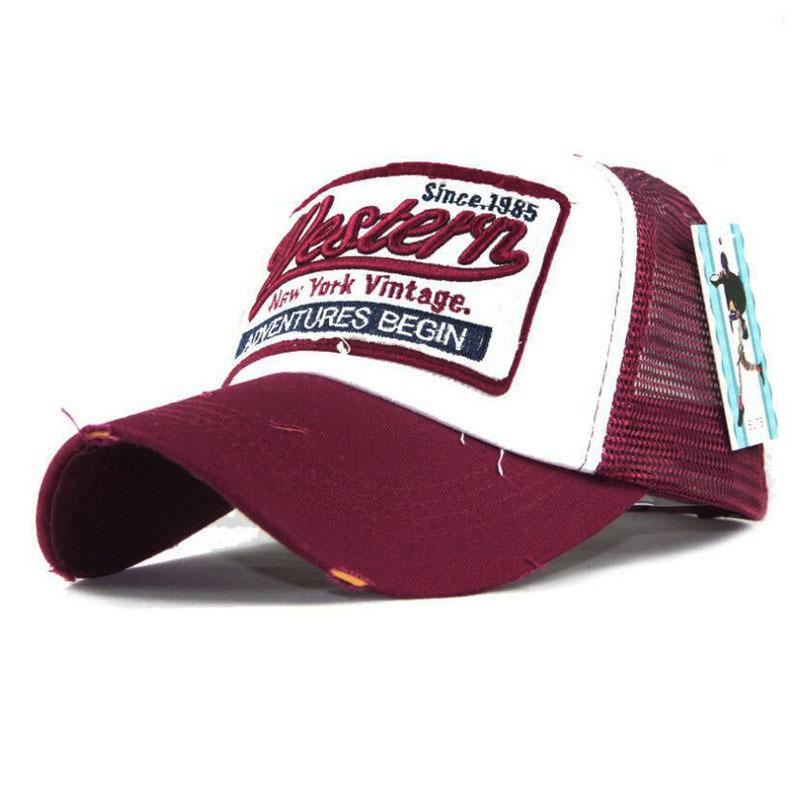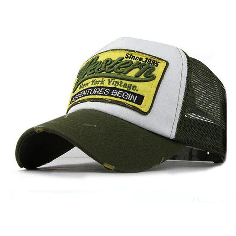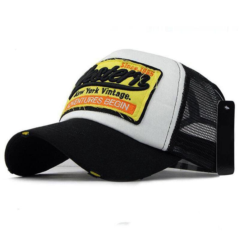 Classic snapback baseball cap trucker hat, embroidered "Western" letters logo patch logo at front.
