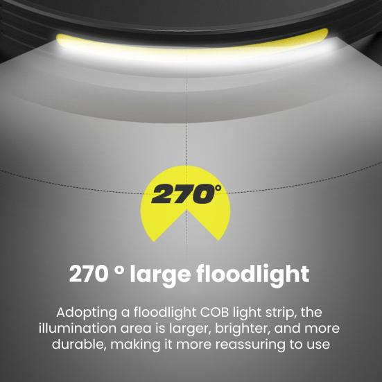 Сверхширокое поле светодиодного освещения 230 градусов: Передняя конструкция включает в себя чрезвычайно широкий светодиодный массив, обеспечивающий широкий угол обзора в 230 градусов.. Эта обширная подсветка обеспечивает улучшенную видимость и безопасность в темных условиях, идеально подходит для ночных приключений или детальной работы вблизи.