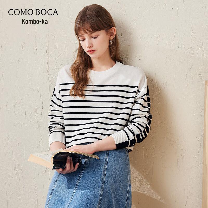 Женский осенне-зимний шерстяной свитер Komongboka в черно-белую полоску с круглым вырезом