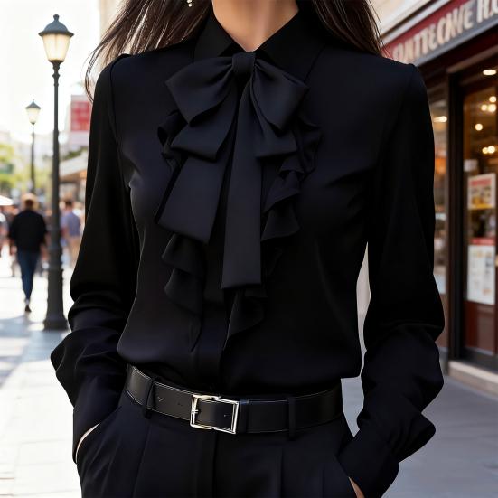 Осенняя женская рубашка с лацканами, бантом и оборками, с длинным рукавом, топы, застежка на пуговицы, универсальная посадка, рубашка для повседневной носки
