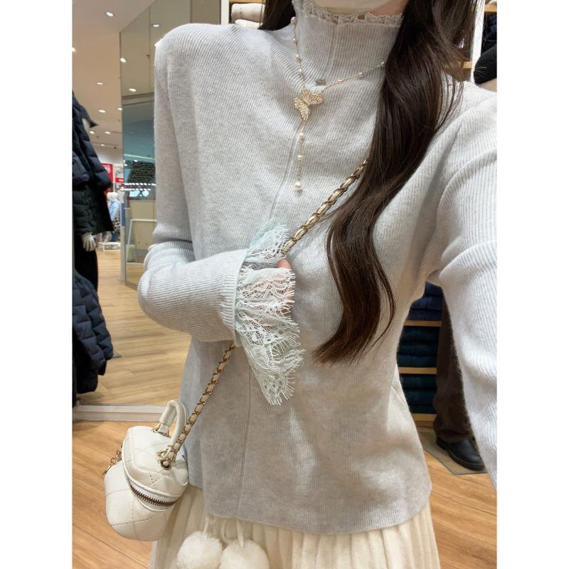 Высококлассный элегантный трикотажный свитер с полувысоким воротником, женский топ с кружевной вставкой, новинка осени и зимы, рубашка с расклешенными рукавами для ношения под низ
