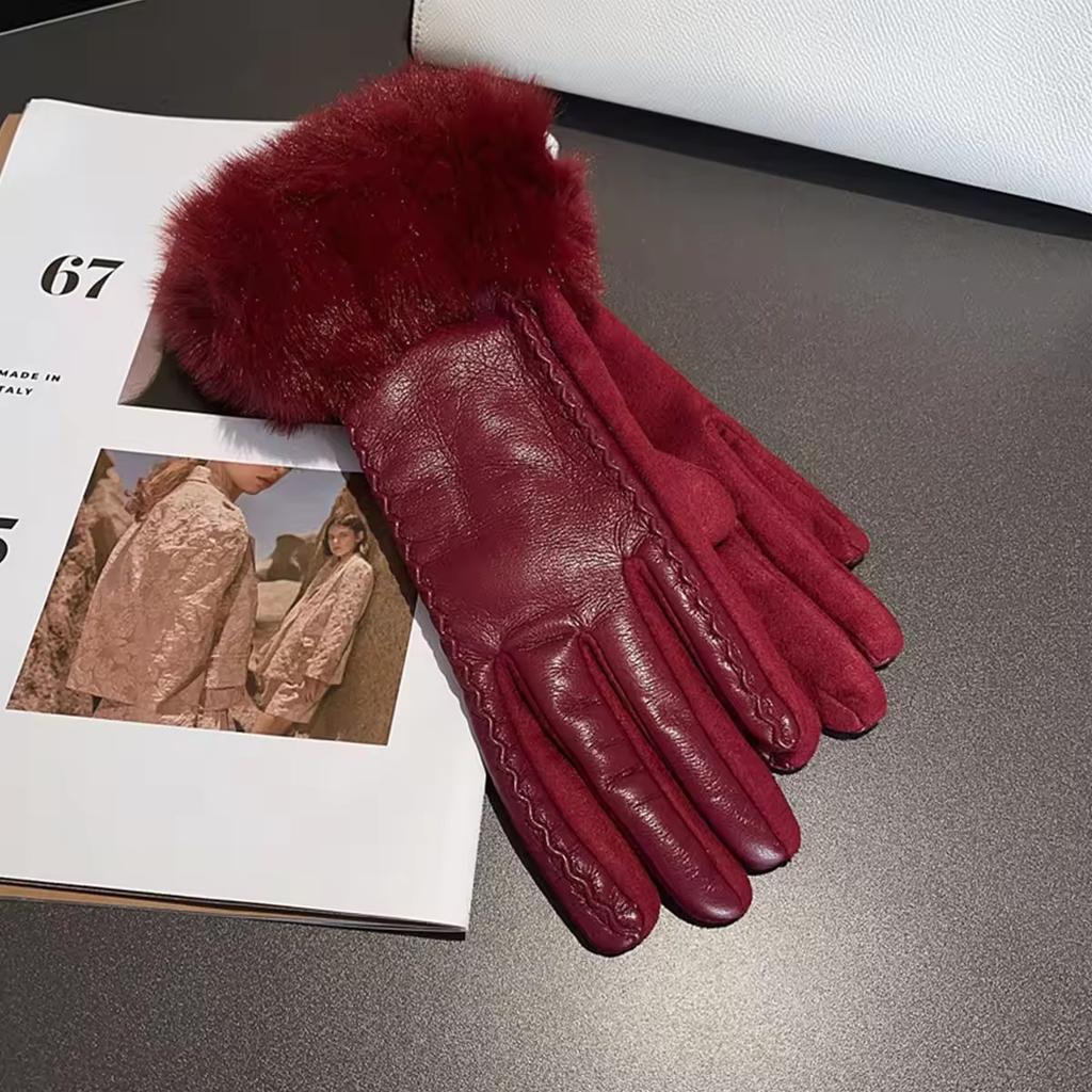 Зимние теплые перчатки из ПУ кожи для женщин, водонепроницаемые, флисовые, теплые, ветрозащитные, модные, элегантные, с искусственной отделкой на манжетах, теплые