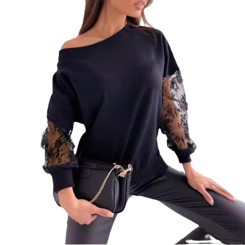 Женская европейская и американская однотонная футболка с длинным рукавом и кружевной вставкой, весна/лето 2024