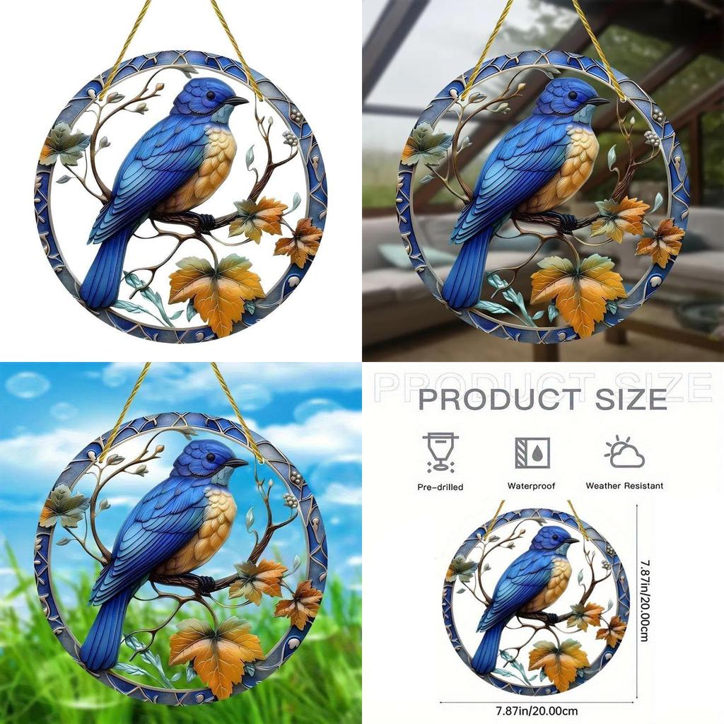 This colorful acrylic light catcher features a round shape, displaying a vibrant blue bird design in modern art style. Crafted from durable acrylic, it resists weather and adds visual appeal to outdoor gardens or patio spaces. Suitable for holiday, housewarming, or celebration gifts, it enhances decorative ambiance. Clean with a damp cloth to maintain clarity.