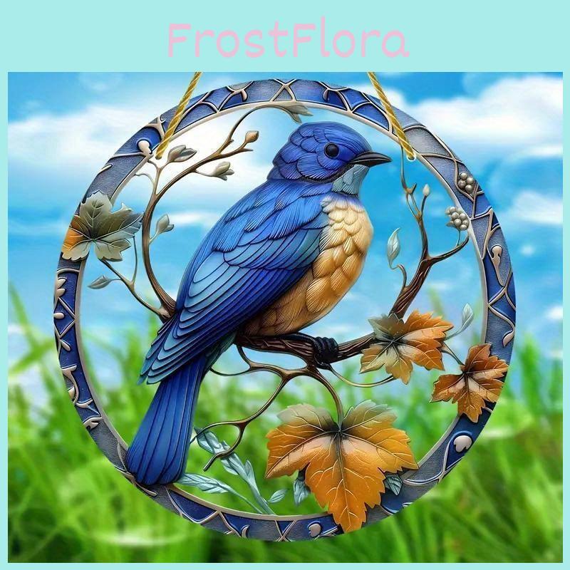 Simulated Blue Bird Branch Pattern Circular Acrylic Pendant For Garden Outdoor Decor