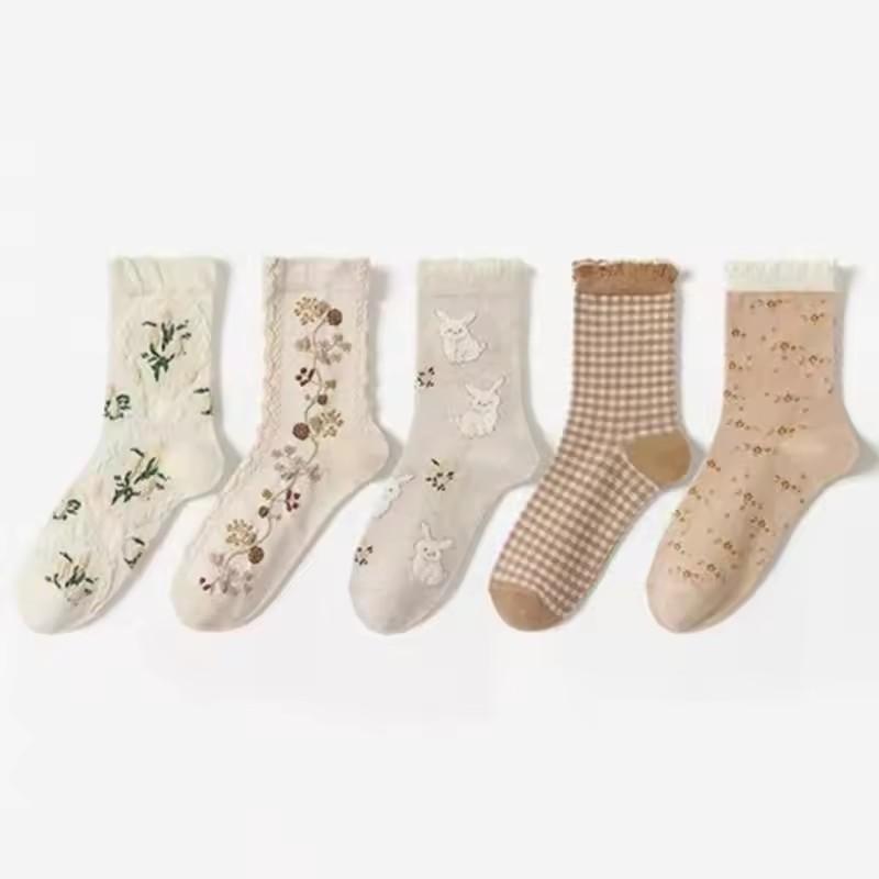 5 пар женских носков средней длины с мультяшным принтом, с ретро-цветочными узорами и животными, удобные, впитывающие пот, дышащие, повседневные носки