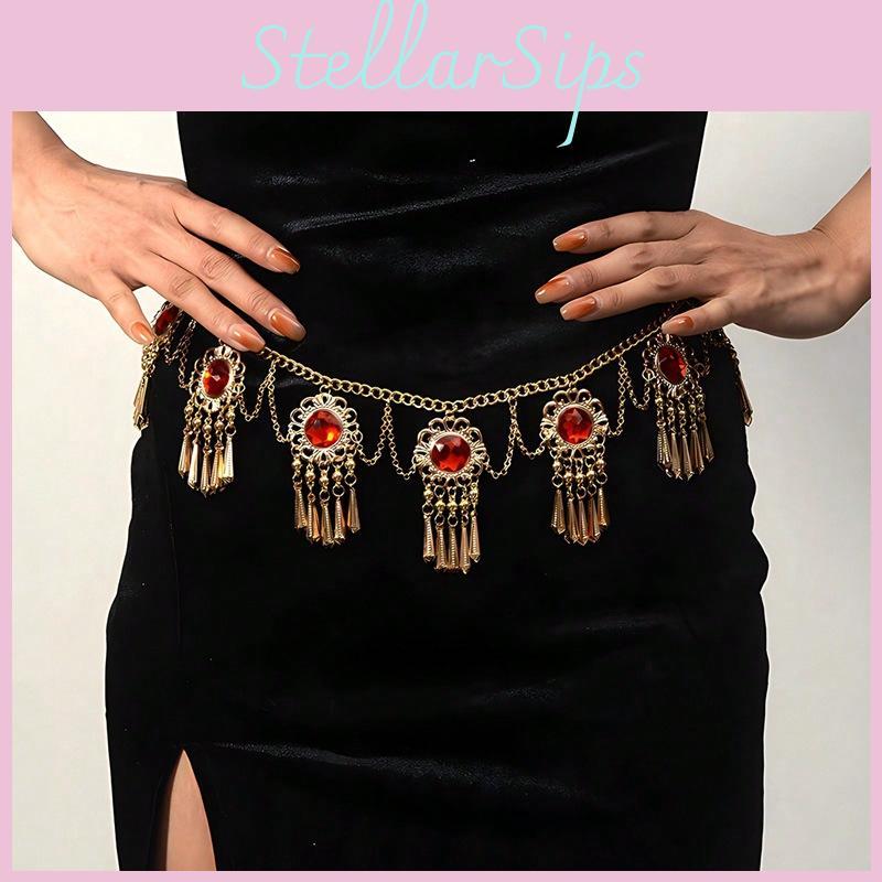 Bohemian Ethnic Red Acrylic Gemstone Fringe Waist Chain With Flower Pendant For Women